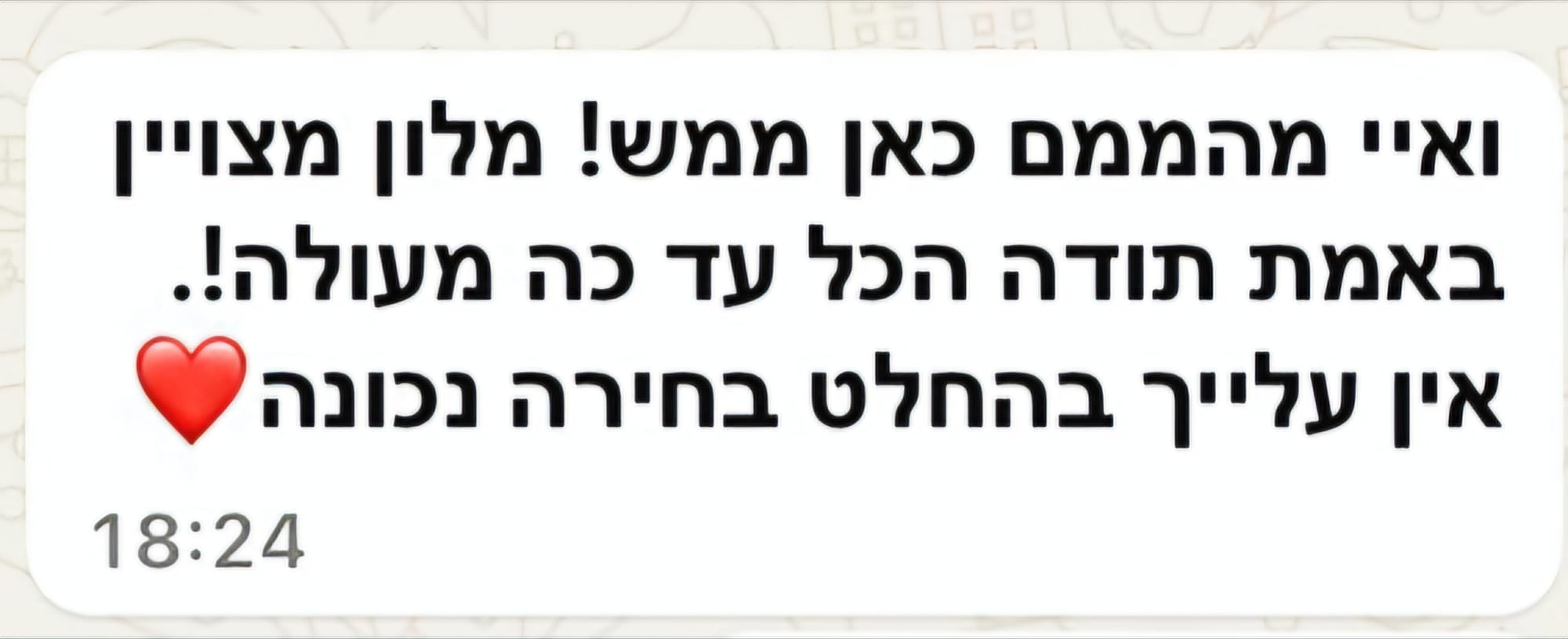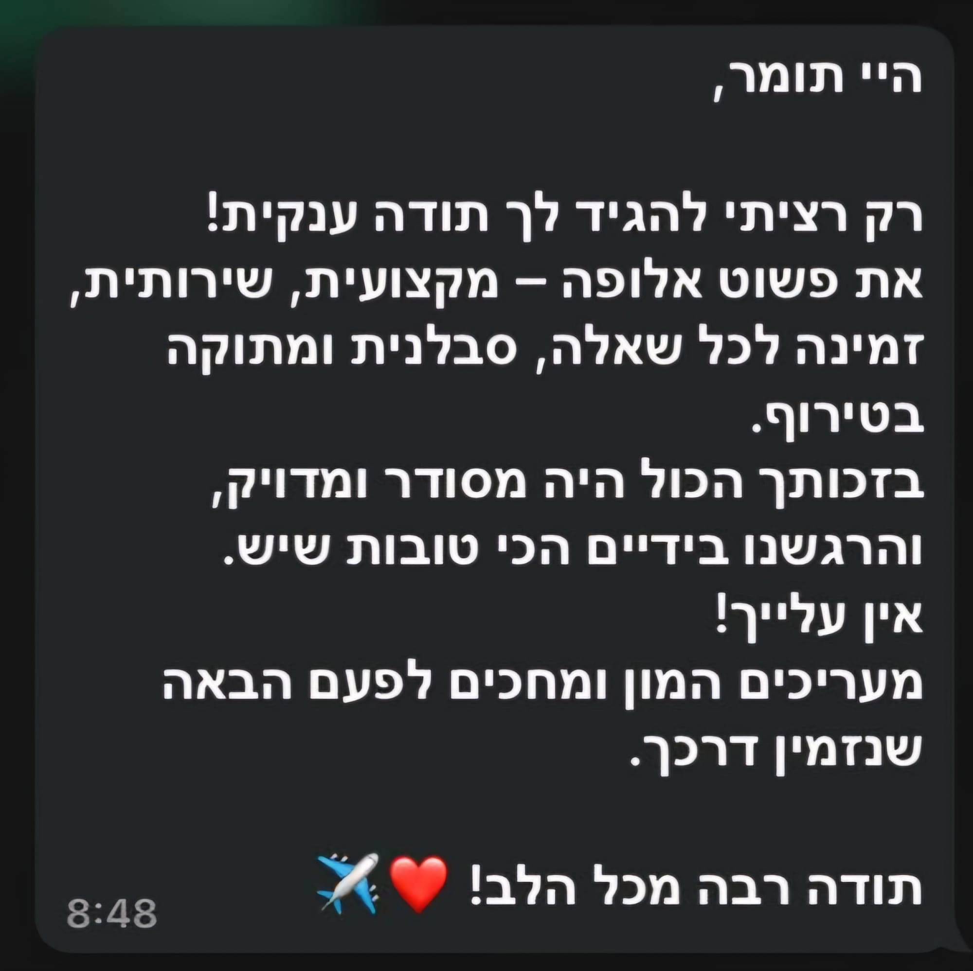 אם חס וחלילה משהו לא ילך לפי המתוכנן כשאת.ה כבר בחו"ל - טלפון אחד אלי ואעזור להסדיר את הדברים.